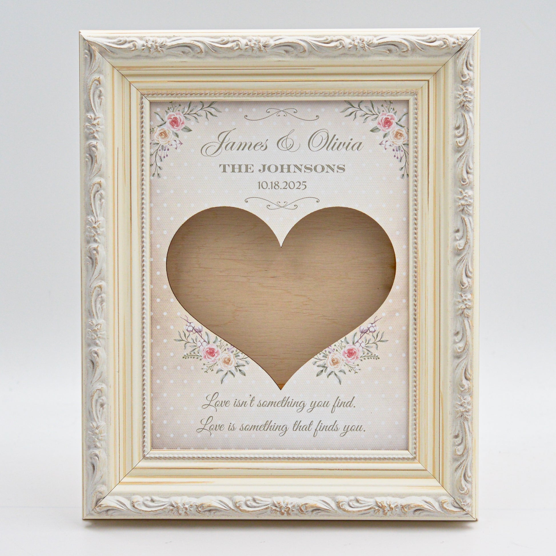 The vintage white frame and softly textured canvas front give the piece a romantic, antique feel — perfectly suited for rustic, classic, or vintage-themed weddings.