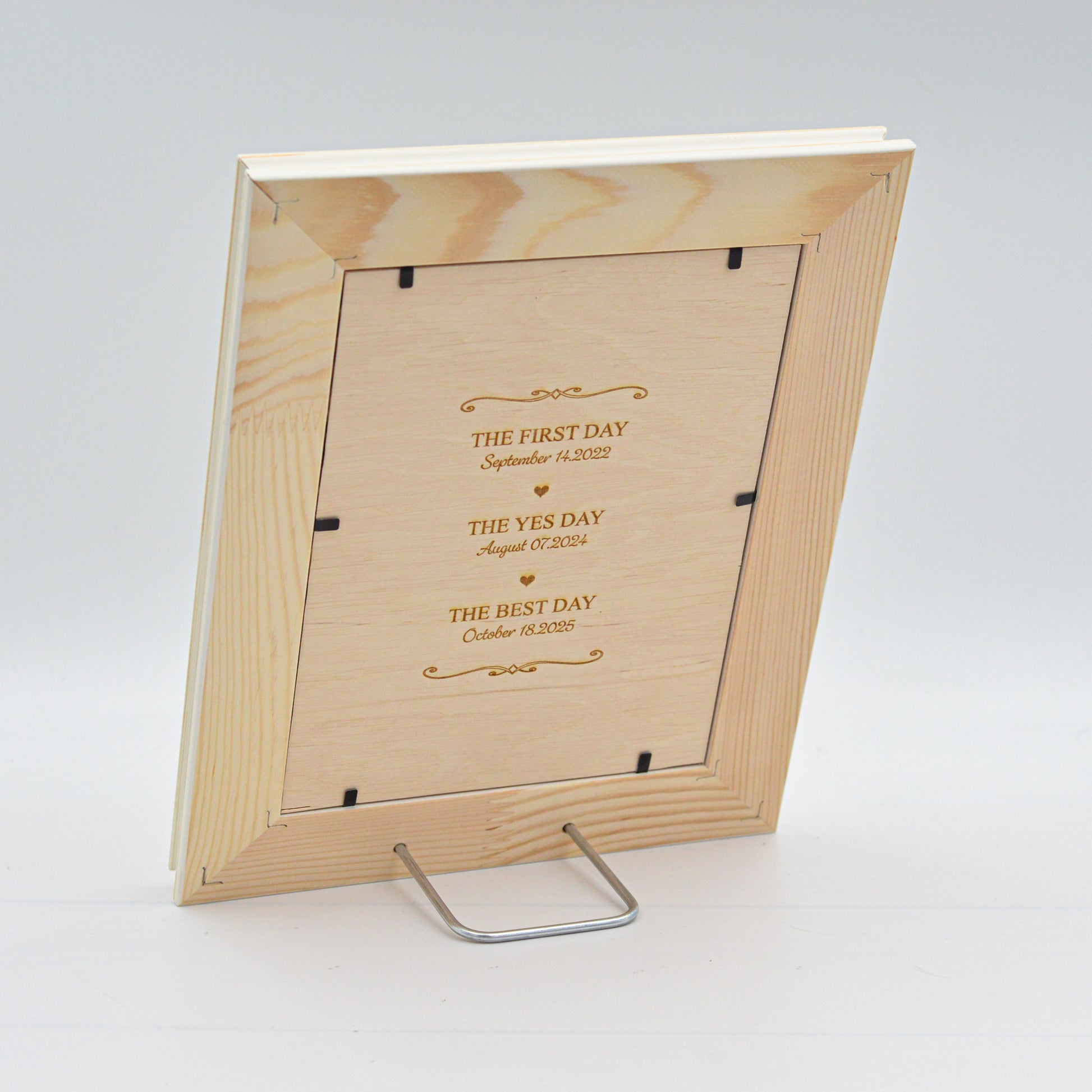 This allows the frame to stand beautifully on any surface — on a table, shelf, or as part of your wedding decor — without any visible stand, giving it a clean, harmonious look.