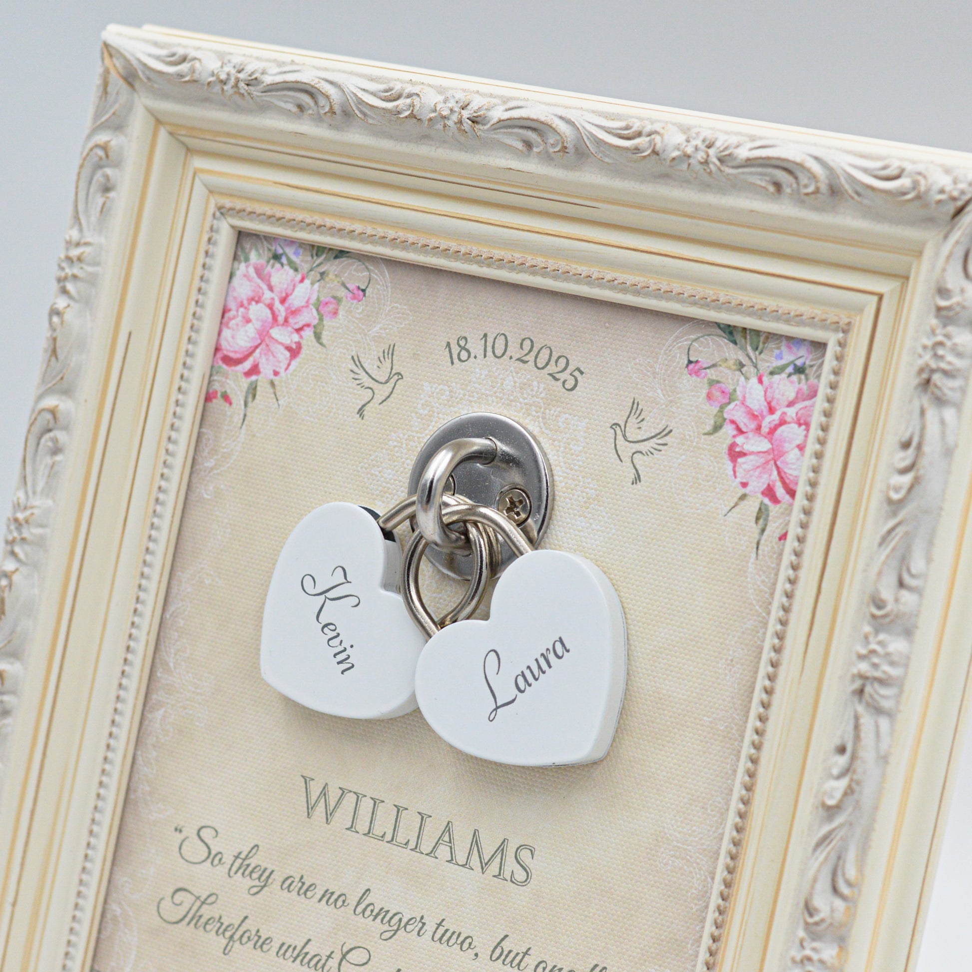 This is where your personal details come to life — engraved names on the locks, your wedding date, your new shared family name, and even a favorite quote or short message that reflects your journey together.