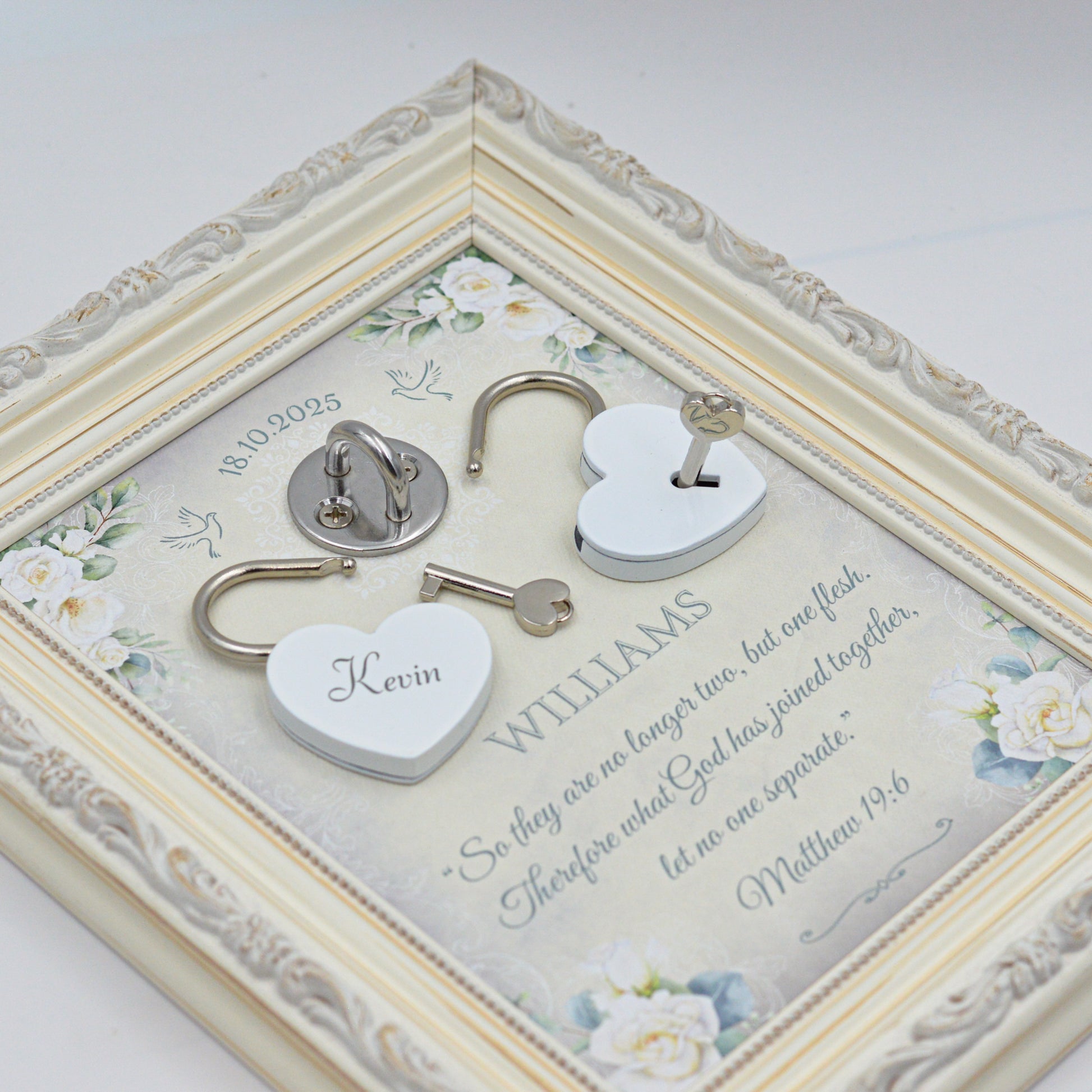 Unity Wedding Lock Ceremony Set – Vintage Personalized Keepsake Frame (White Roses)