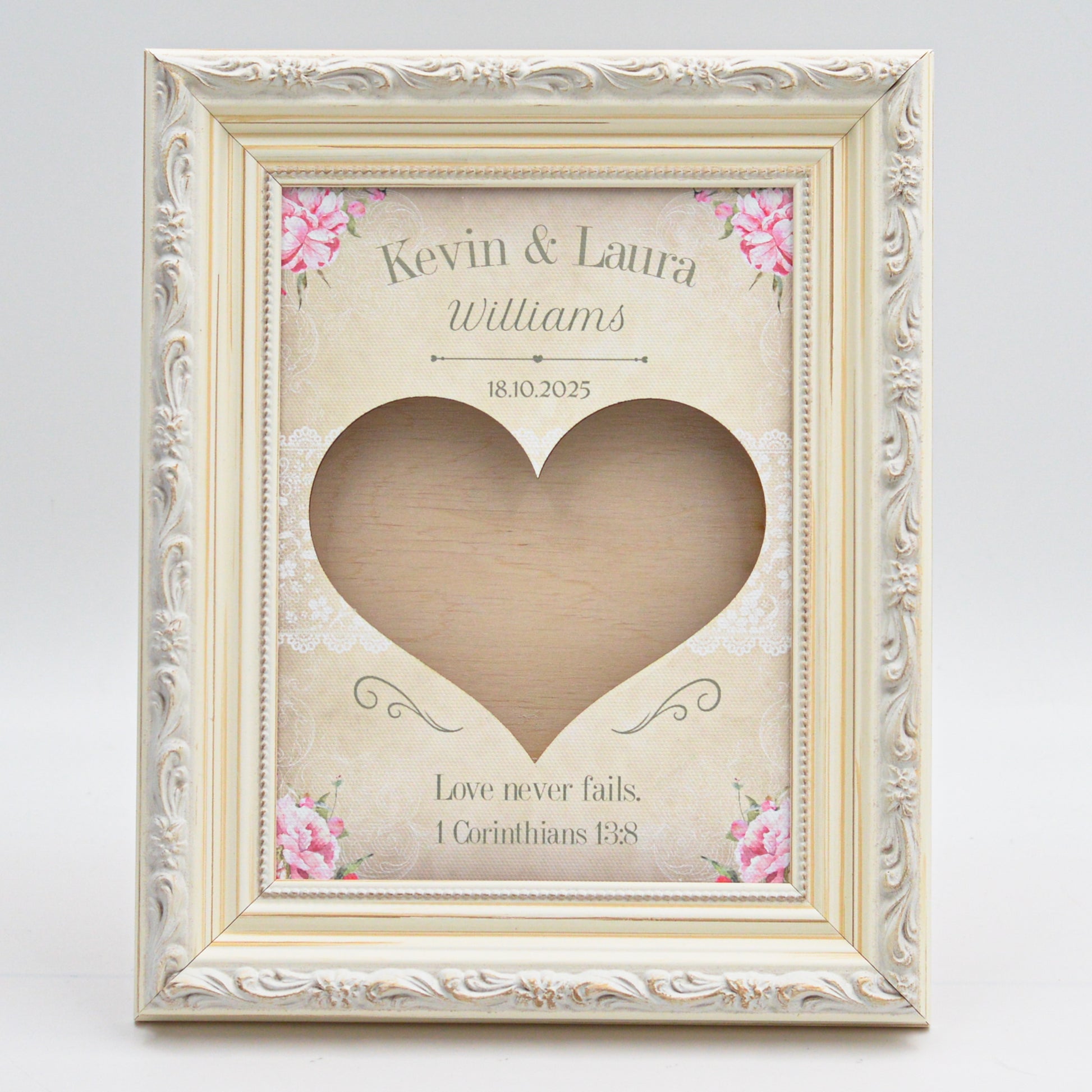 The vintage white solid pine wood frame gives a timeless, antique feel, while your names, wedding date, and quote make the design truly personal and heartfelt.